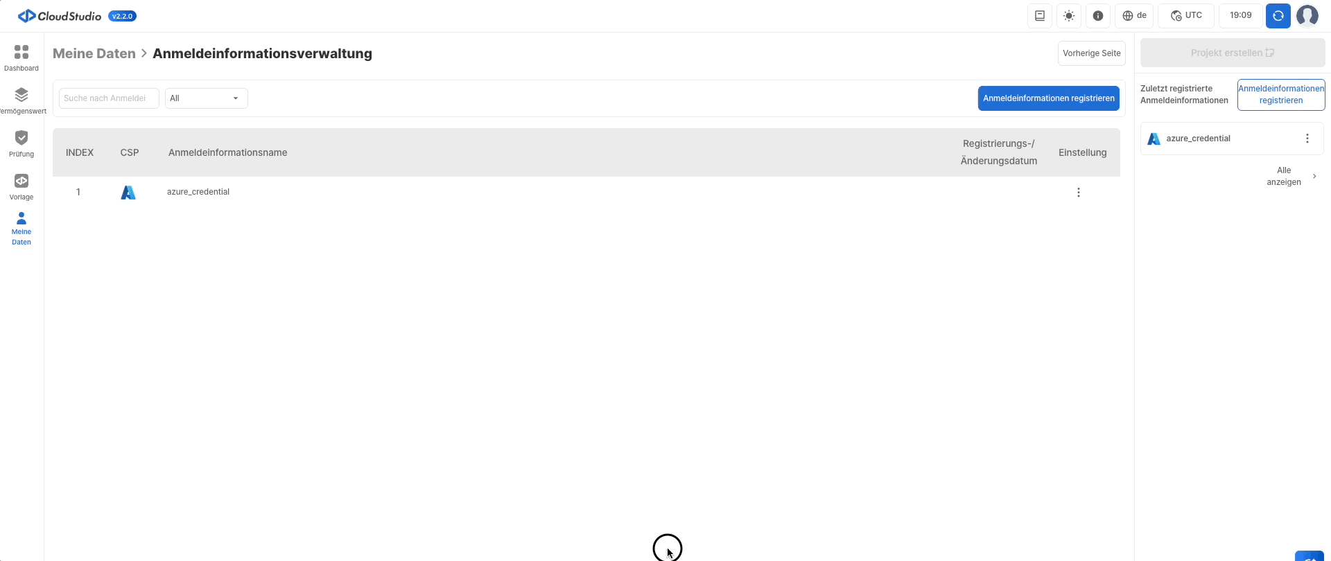 Auf der Seite zur Verwaltung von Anmeldeinformationen können registrierte Anmeldeinformationen eingesehen und gelöscht werden.